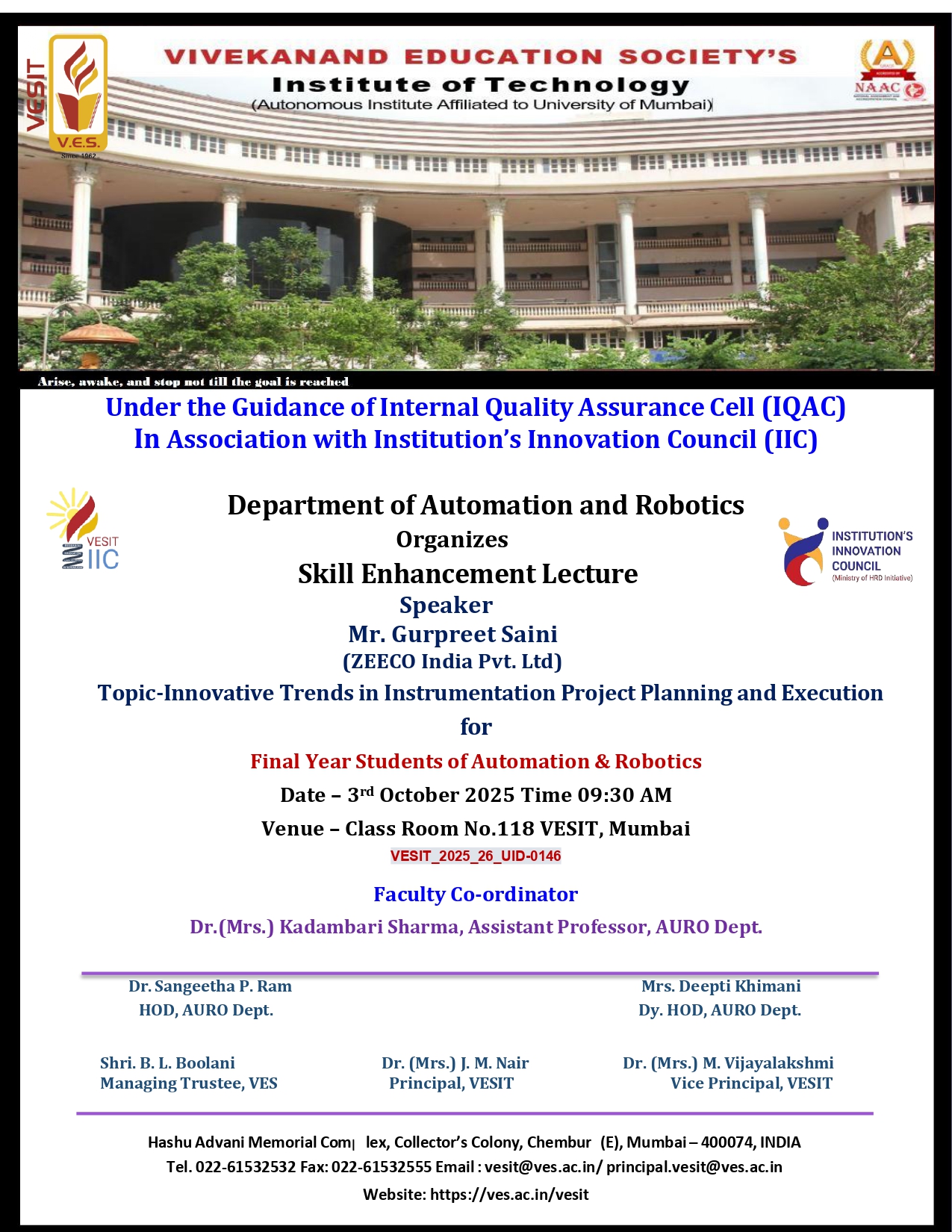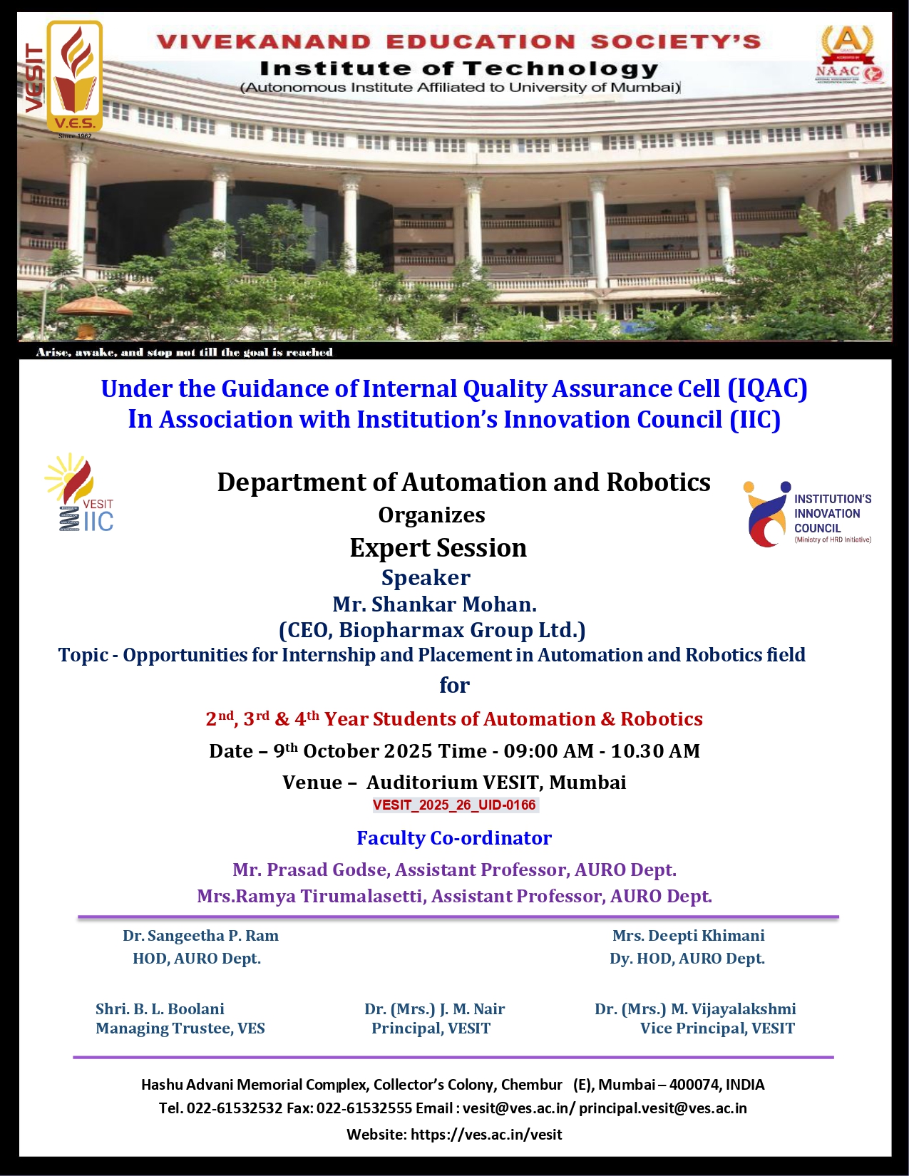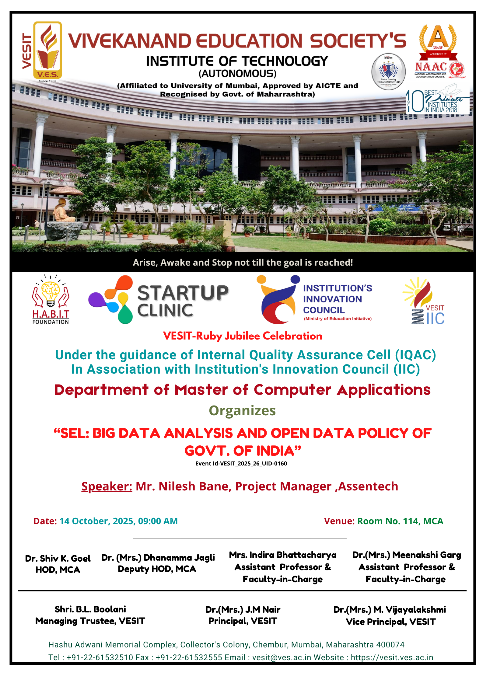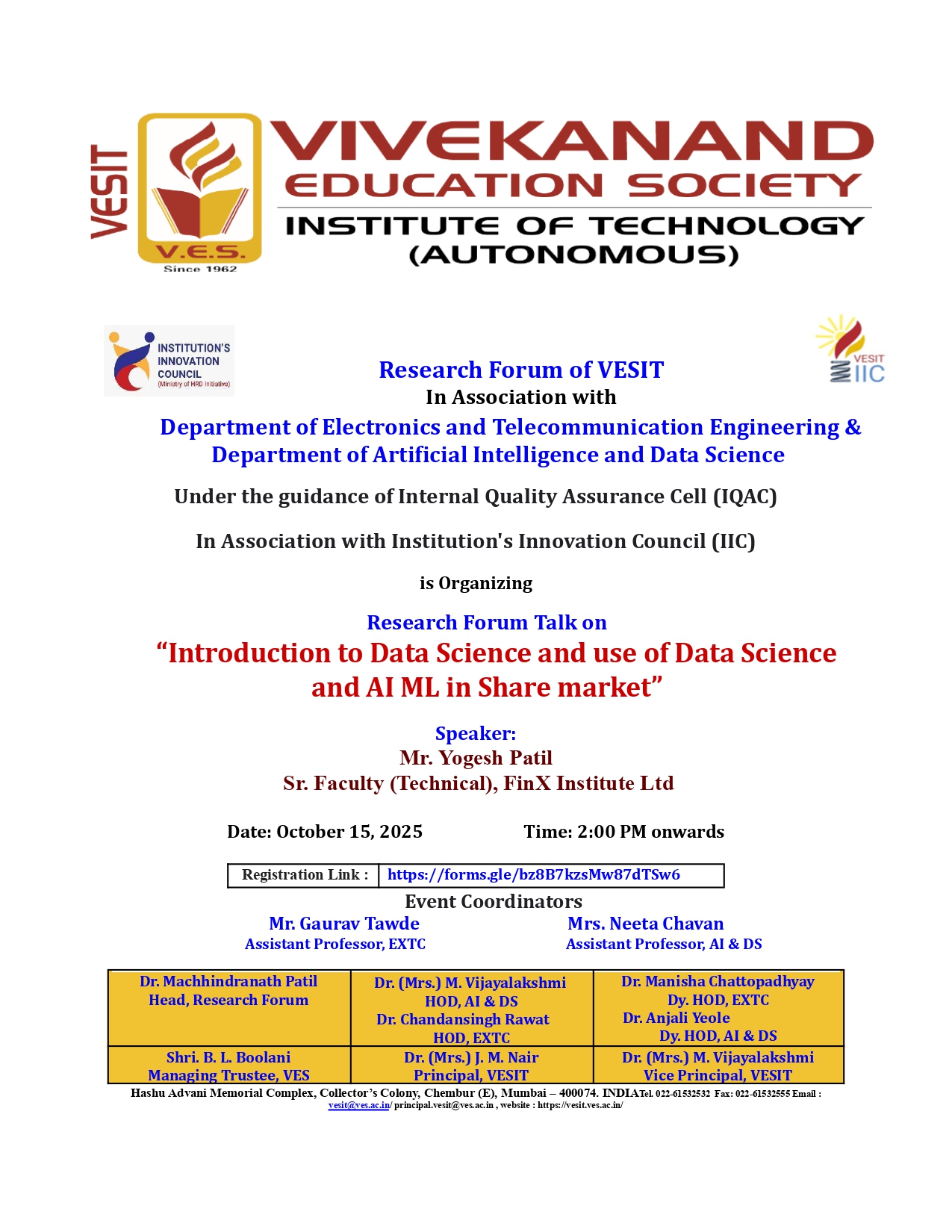 The Ministry of Human Resource Development (MHRD), Government of India has established ‘MHRD’s Innovation Cell (MIC)’ to systematically foster the culture of Innovation amongst all Higher Education Institutions. The primary mandate of MIC is to encourage, inspire and nurture young students by supporting them to work with new ideas and transform them into prototypes while they are informative years. MIC has envisioned encouraging creation of ‘Institution’s Innovation Council (IICs)’ across selected Higher Education Institutions. A network of these IICs is established to promote innovation in the Institution through multitudinous modes leading to an innovation promotion eco-system in the campuses. VESIT is one of these institutions which established ‘Institution’s Innovation Council’ in September 2019.