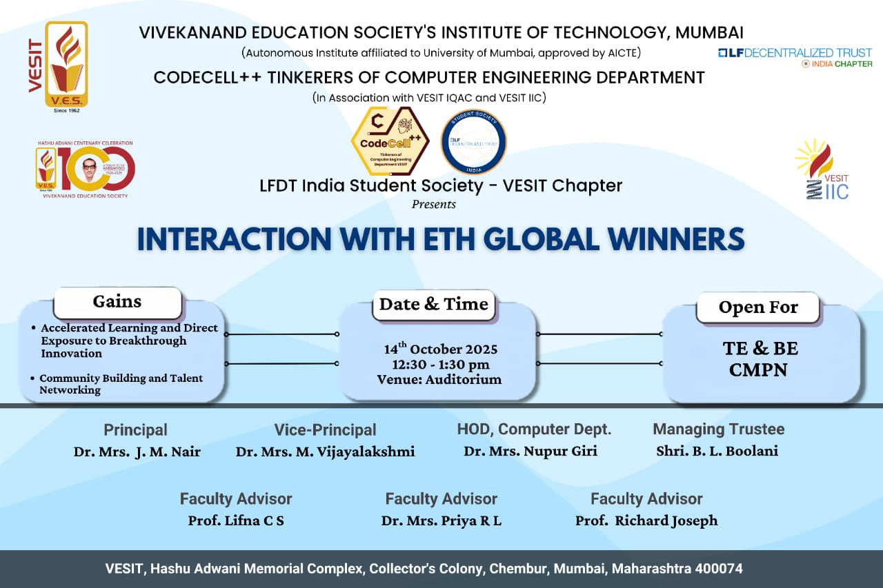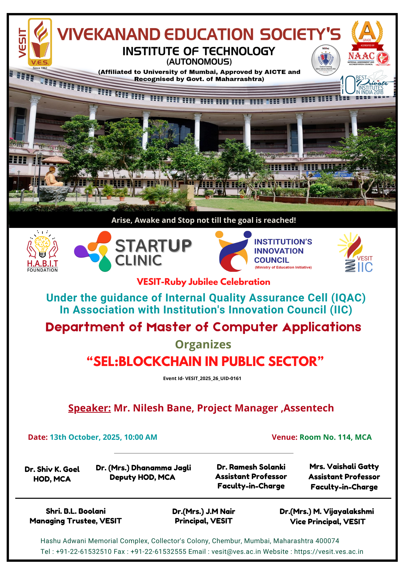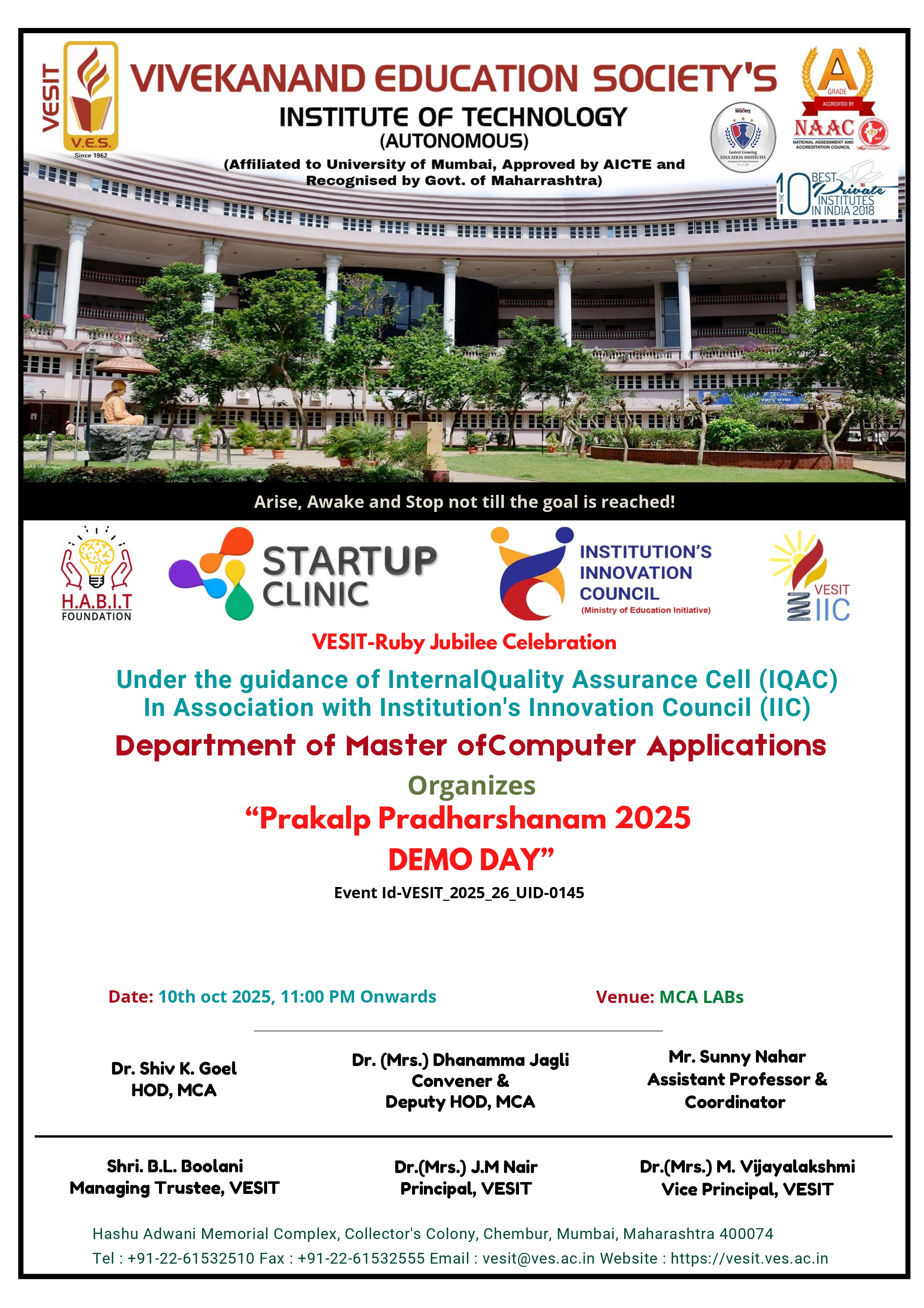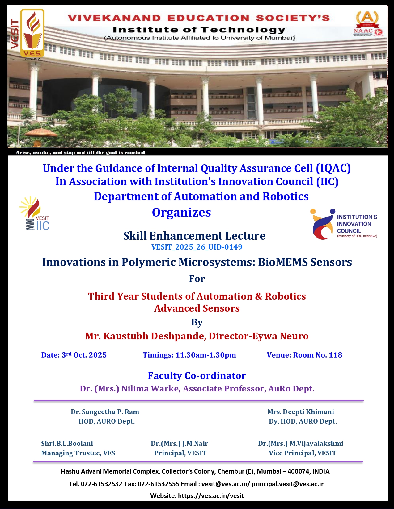The Ministry of Human Resource Development (MHRD), Government of India has established ‘MHRD’s Innovation Cell (MIC)’ to systematically foster the culture of Innovation amongst all Higher Education Institutions. The primary mandate of MIC is to encourage, inspire and nurture young students by supporting them to work with new ideas and transform them into prototypes while they are informative years. MIC has envisioned encouraging creation of ‘Institution’s Innovation Council (IICs)’ across selected Higher Education Institutions. A network of these IICs is established to promote innovation in the Institution through multitudinous modes leading to an innovation promotion eco-system in the campuses. VESIT is one of these institutions which established ‘Institution’s Innovation Council’ in September 2019.