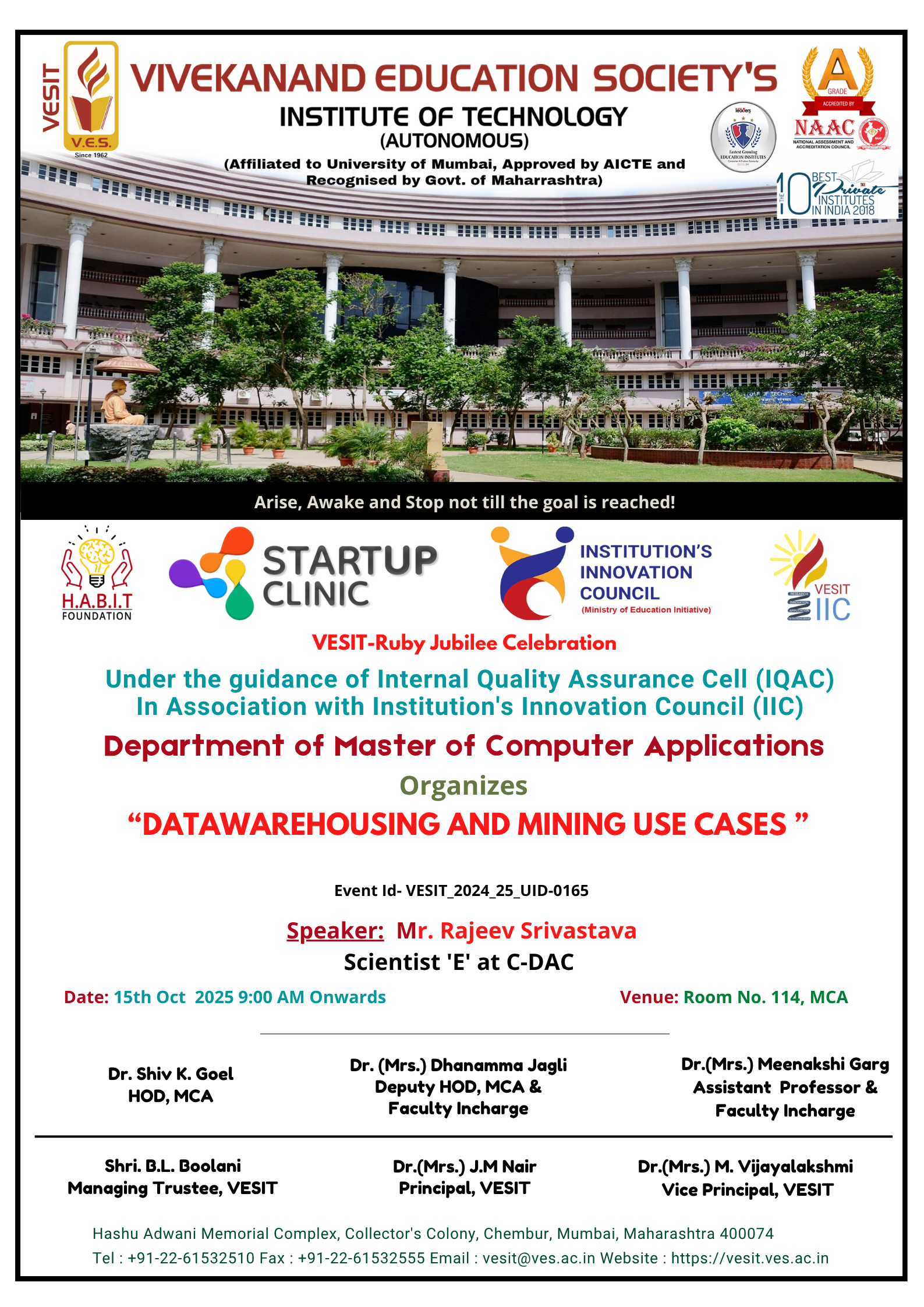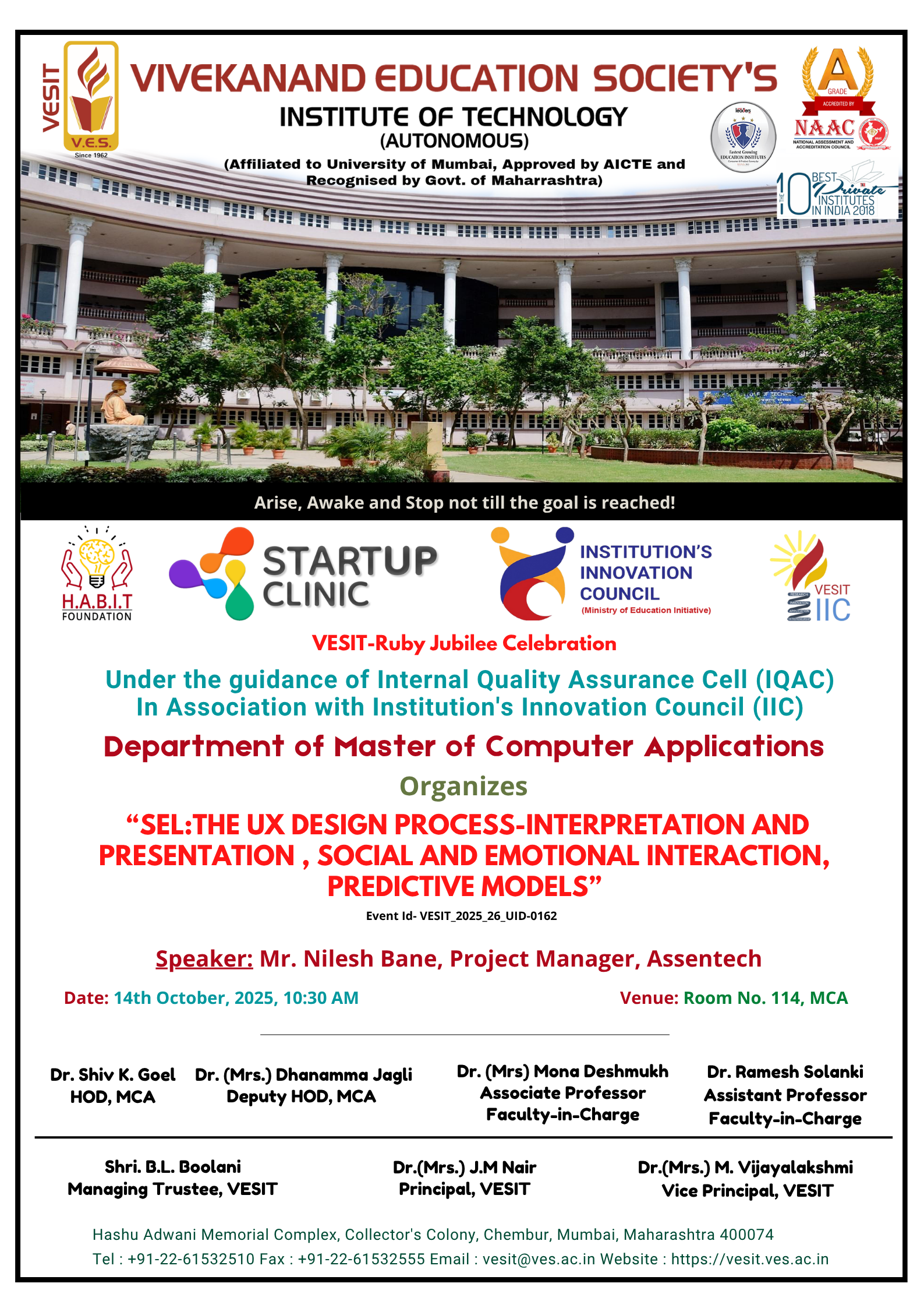 VESIT IIC: VESIT IIC majorly focuses on to create a vibrant local innovation ecosystem, start-up supporting Mechanism in our institute, prepare institute for Atal Ranking of Institutions on Innovation Achievements Framework, establish Function Ecosystem for Scouting Ideas and Pre-incubation of Ideas, develop better Cognitive Ability for Technology Students.